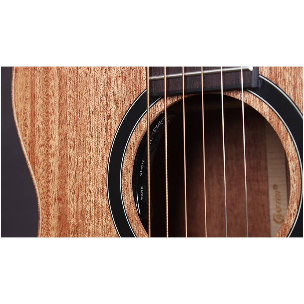 Верхняя дека и корпус электроакустической трэвел-гитары CRAFTER MINO/ALM полностью изготовлены из массива красного дерева, что отличает звучание мощью, певучестью и теплотой, с акцентом на средние частоты. Насыщенный темный цвет под матовым лаком подчеркивает красоту самой древесины и делает внешний вид гитары ярким.