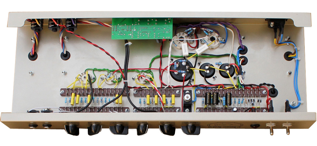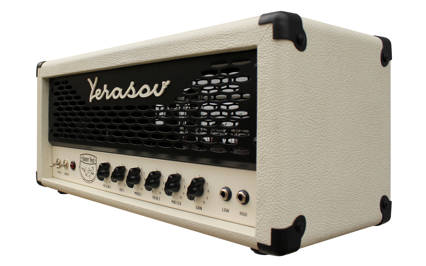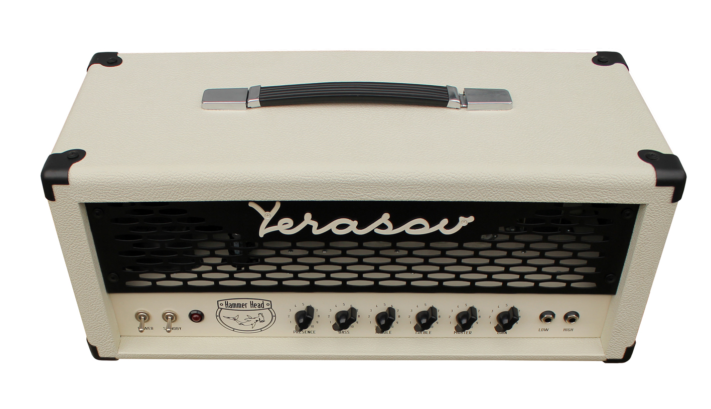 Hammer Head представляет собой классический одноканальный усилитель, выполненный полностью на лампах навесным монтажом. Он предназначен для исполнения музыки в тяжелых рок-стилях 80-х годов, как в условиях звукозаписывающих студий, так и на сцене. Усилитель выполнен на 3х лампах ECC83S в предусилителе и 2х лампах EL34, работающих в оконечном усилителе. Два входа, Hi и Low, разной чувствительности позволяют получить гибкую систему использования как просто гитарного усилителя со своим перегрузом, так и в качестве усилителя, подключаемого к гитарному процессору или просто как усилитель мощности. 3х полосный классический гитарный эквалайзер и встроенный в оконечный усилитель регулятор позволяют в широких пределах менять оттенки звучания усилителя в сочетании с любым гитарным кабинетом сопротивлением 4, 8 или 16 Ом. Наличие отдельных регуляторов громкости усиления и входов с разной чувствительностью позволяет гибко настроить характер перегруза от кристально чистого звука до глубокого овердрайва. Усилитель имеет гнезда для подключения петли внешних эффектов, что позволяет произвести дополнительную обработку звука внешними устройствами.Характеристики: