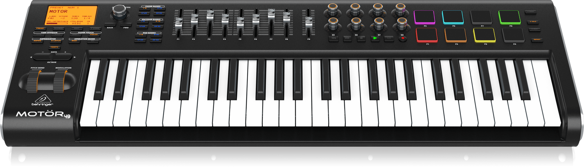 MOTOR 49 работает в MIDI и Mackie Control режимах, которые автоматически сопоставляют все 49 клавиш с наиболее часто используемыми параметрами инструментов программного обеспечения. Плюс доступны для скачивания на сайте компании пресеты, включая специфические комбинации программного/аппаратного обеспечения. Клавиатура имеет секцию перемещения с подсветкой, которая предоставляет быстрый доступ к режимам воспроизведения и записи, а также к обмену между банками фейдеров, энкодеров и пэдов и все это простым нажатием кнопки. Эту фантастическую клавиатуры Вы можете подключать к своему Мас или РС и инструментам через USB или MIDI In/Out/Thru. Вы не найдете другой такой универсальный USB/MIDI контроллер/клавиатуру с моторизированными фейдерами и пэдами по такой цене!