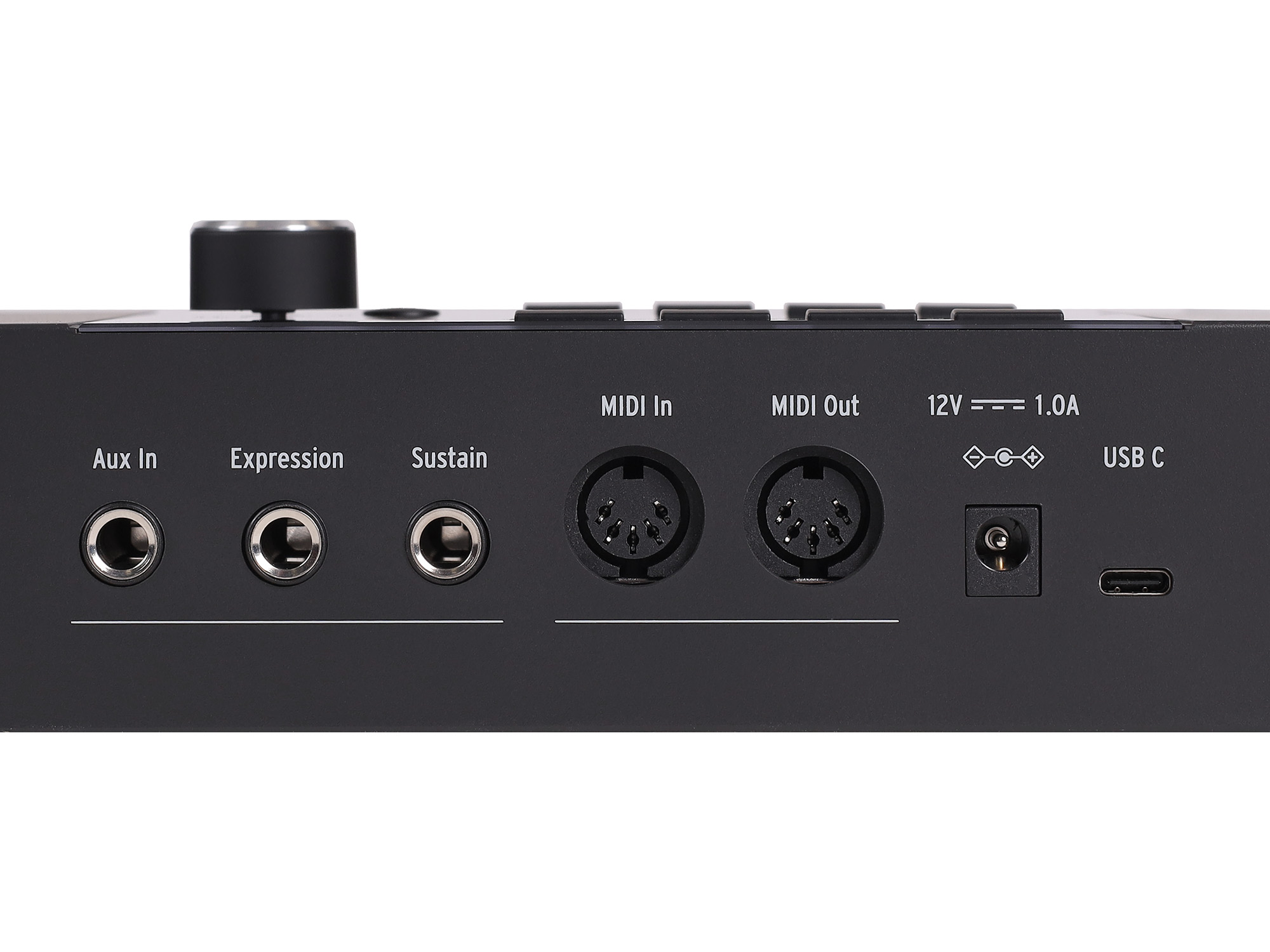 Подключение: вход для педали экспрессии, вход для педали сустейн, Aux In, MIDI IN/OUT, USB-C