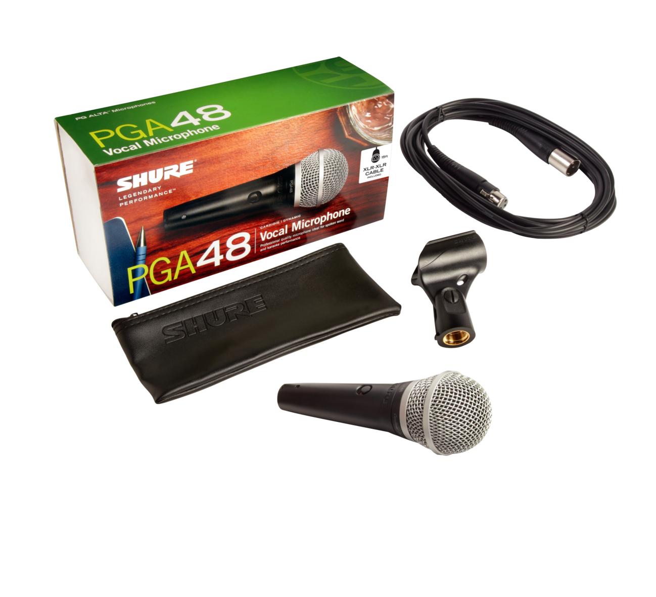 Shure PGA48-XLR-E – динамический микрофон, специально разработанный для воспроизведения голоса. Идеально подходит для использования в концертном зале, ночном клубе или караоке-баре в качестве вокального микрофона. Данная модель соответствует высокому стандарту качества компании Shure, известной во всем мире в первую очередь благодаря своим микрофонам. Буквы «XLR-E» в названии модели означают комплектацию, которая в данном случае включает в себя сам микрофон, мягкий чехол, держатель на микрофонную стойку и кабель XLR-XLR.Модель имеет кардиоидную диаграмму направленности, которая отлично проявляет себя в концертных условиях, поскольку не воспринимает звуки по бокам и сзади от капсюля, а концентрируется именно на звуке спереди. Динамический тип микрофона не пользуется большой популярностью для записи вокала в студии, однако для живого выступления его применение полностью оправдано гораздо меньшей чувствительностью к посторонним звукам, а также способностью не перегружаться от большого звукового давления. Данная модель способна воспринимать частотный диапазон от 70 Гц до 15 кГц. Этой характеристики вполне достаточного для передачи разборчивой речи и насыщенного пения. На корпусе микрофона есть удобный переключатель включения/отключения. АЧХ микрофона имеет небольшой подъем в районе 4-5 кГц. Именно эти частоты лучше всего слышат человеческие уши, и их усиление способствует повышению разборчивости и громкости голоса.