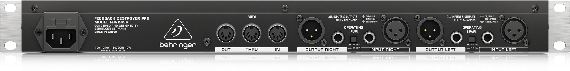 Два канала в Behringer FBQ 2496 Feedback Destroyer Pro представлены балансными входами и выходами на разъемах XLR и 1/4" TRS. Также имеются входы и выходы MIDI для подключения сторонних контроллеров. Кнопки имеют светодиодную подсветку, а в управлении помогает трехсимвольный ЖК-дисплей.