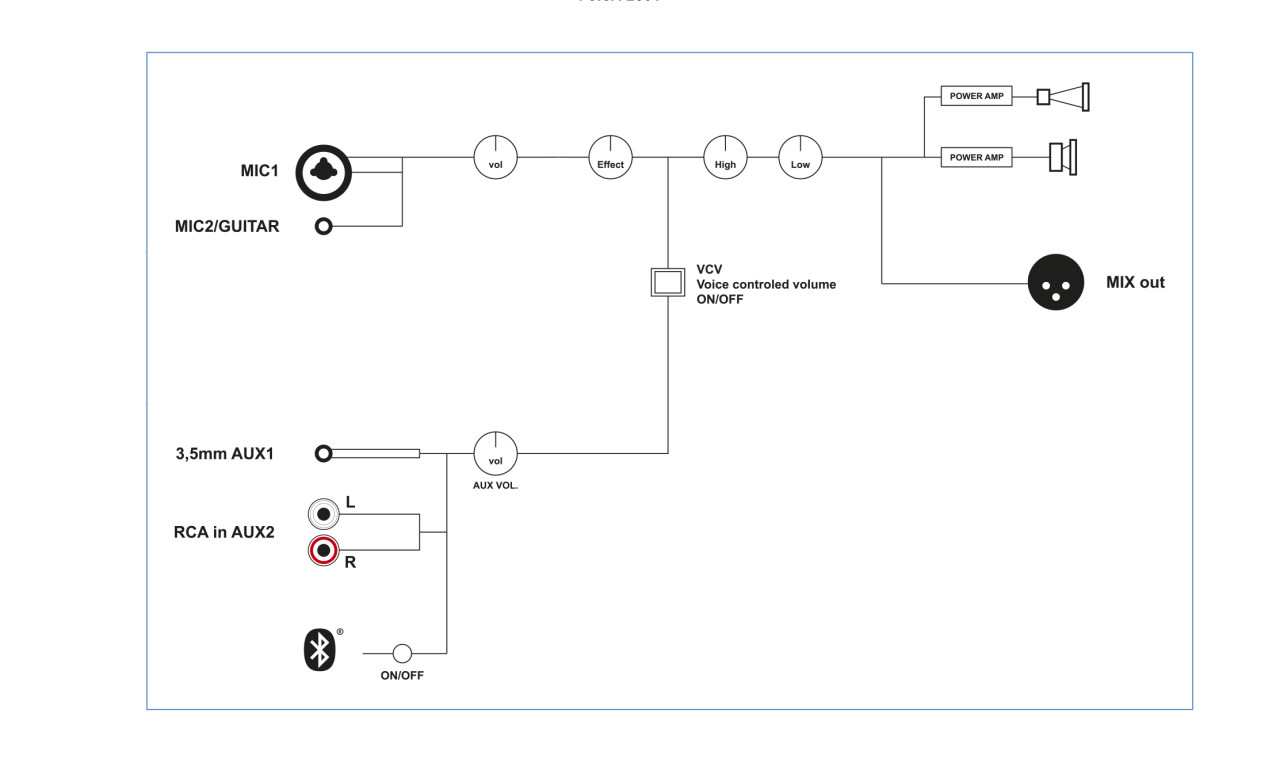 Управление: громкость микрофона, громкость реверберации, линейная громкость, переключатель VCV вкл. / выкл., мастер громкость, высокие частоты, бас, беспроводная технология Bluetooth вкл. / выкл.