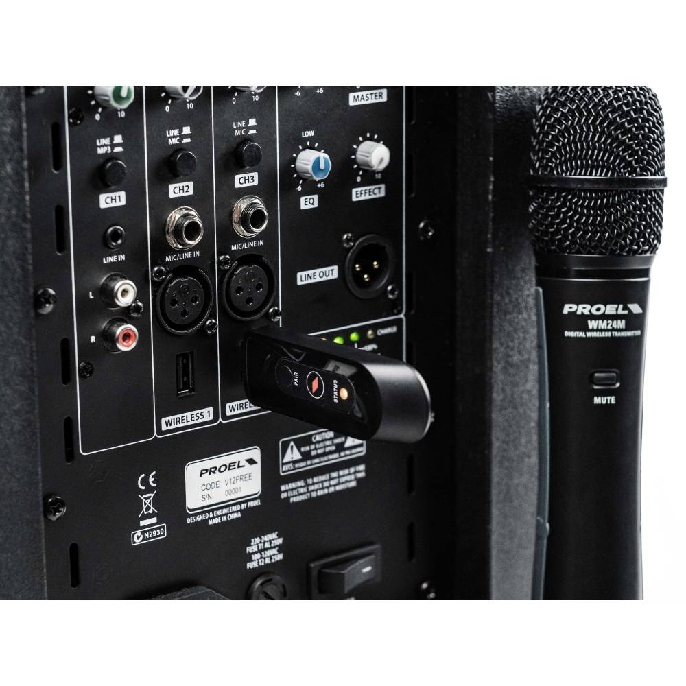 Приёмник, питающийся по USB-шине, работает в режиме передачи сразу двух типов сигнала, автоматически направляя нужный в зависимости от типа подключения: аналогового или цифрового. Это позволяет подключать устройство к PC или MAC без установки драйверов для осуществления записи в используемый Вами DAW. А использование соответствующего адаптера позволит подключить радиосистему даже к устройствам на базе IOS или Android, позволяя записывать звук в любом месте. И наконец аппарат обладает совместимостью с акустическими системами PROEL, имеющими вход USB WIRELESS (такие, как V FREE и V WAVE), для подключения профессионального микрофона без использования проводов.