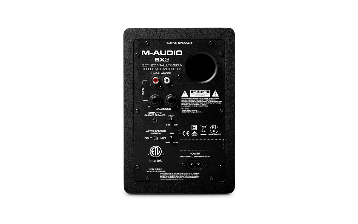 В комплекте: мониторы BX3 (стерео пара), 2-контактный кабель питания IEC, подножки из пеноматериала, 1/8" TS соединительный кабель, кабель 1/8" - 1/8" TRS Aux, кабель 1/8" TRS - RCA, руководство пользователя, руководство по безопасности и гарантии