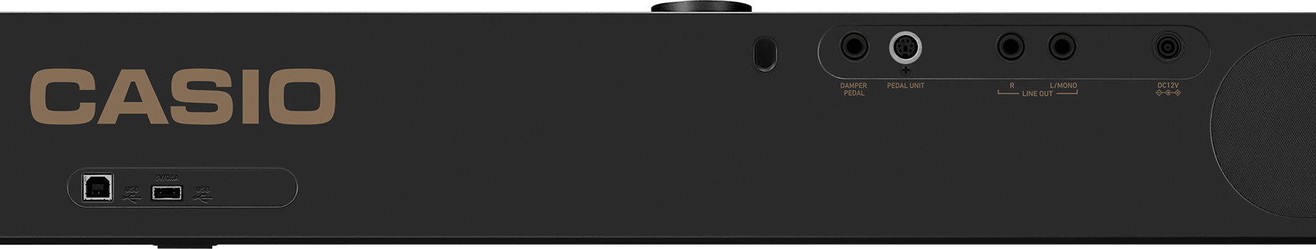 Разъёмы: PHONES / OUTPUT: PHONES: 2 (стерео мини джек), разъем для педали, разъем для 3-педального блока, LINE OUT: 2 L / MONO, R (стандартный разъем), USB типа A (беспроводной MIDI и аудио адаптер), USB типа B