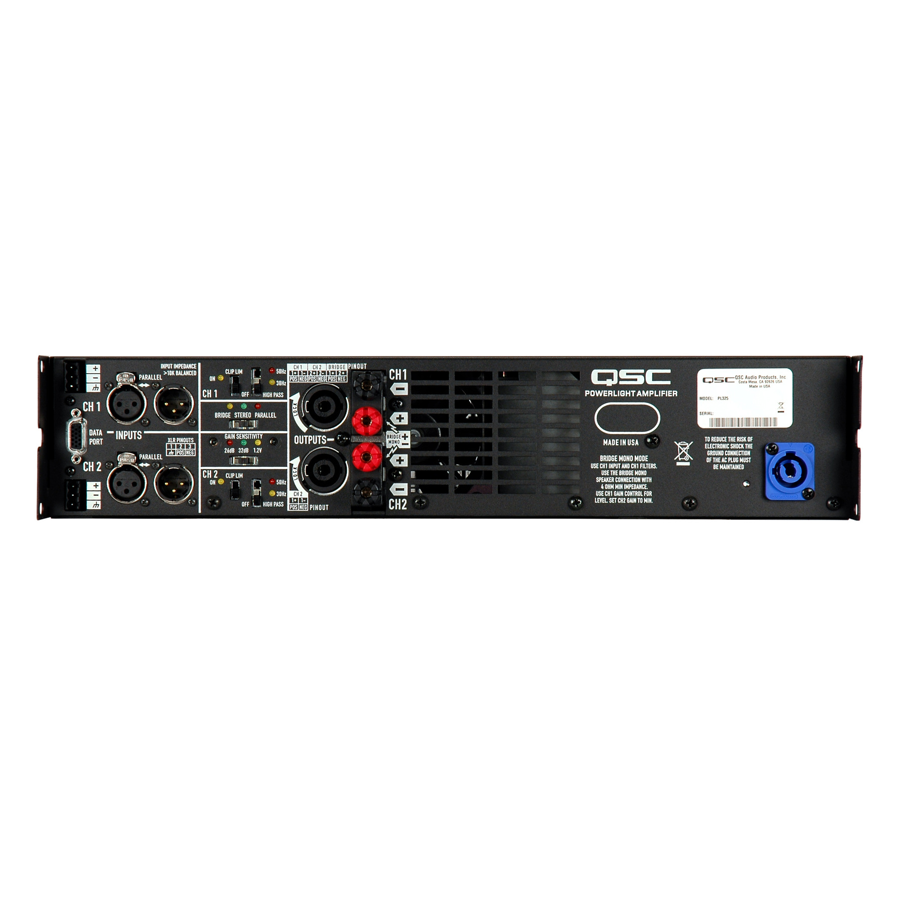 На тыловой панели QSC PL325 можно найти разъем DataPort 15-pin для удаленного контроля и мониторинга через систему Q-SYS, построенную с использованием Ethernet-соединений для управления и коммутации входных сигналов. Поворотные ручки контроллеров снимаемые для обеспечения безопасности, особенно в публичных местах. Усилитель также оборудован лимитерами и тремя НЧ-фильтрами на канал, которые действует в районах 3 Гц, 30 Гц и 50 Гц.