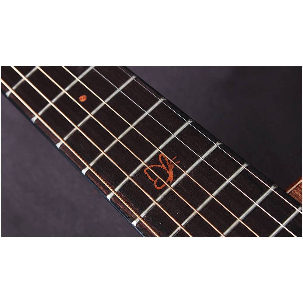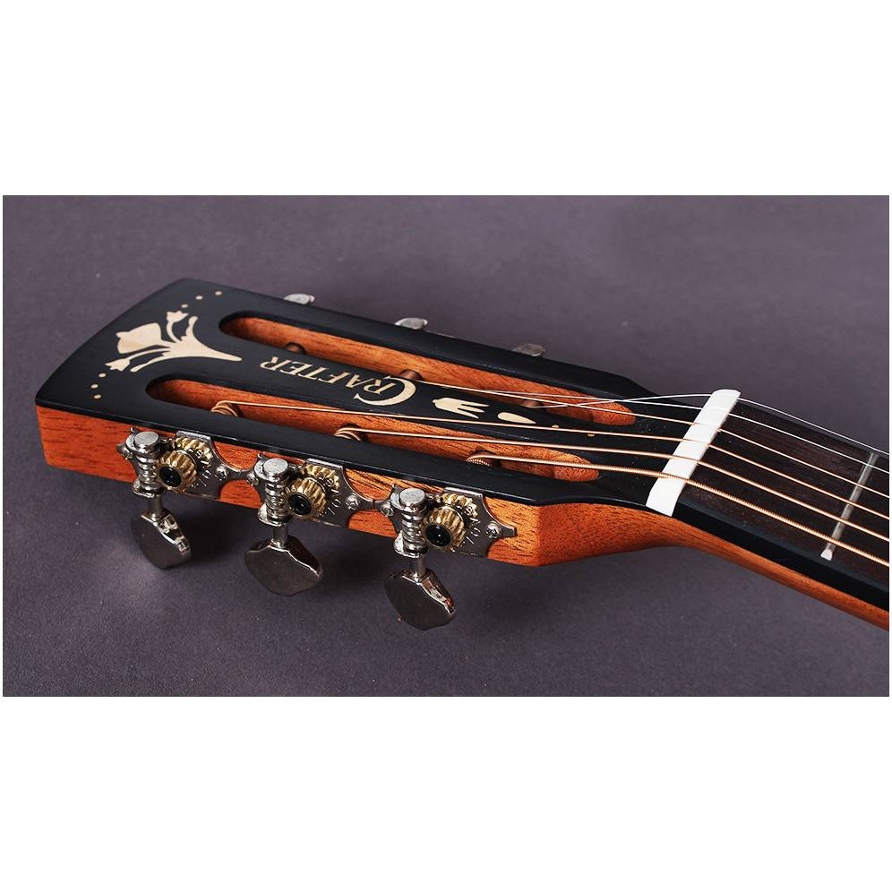 Верхняя дека и корпус электроакустической трэвел-гитары CRAFTER MINO/ALM полностью изготовлены из массива красного дерева, что отличает звучание мощью, певучестью и теплотой, с акцентом на средние частоты. Насыщенный темный цвет под матовым лаком подчеркивает красоту самой древесины и делает внешний вид гитары ярким.