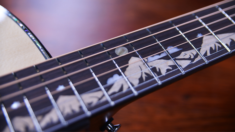 Деревянная инкрустация розетки и маркеров ладов аккуратно дополняет безупречный стиль этой гитары
