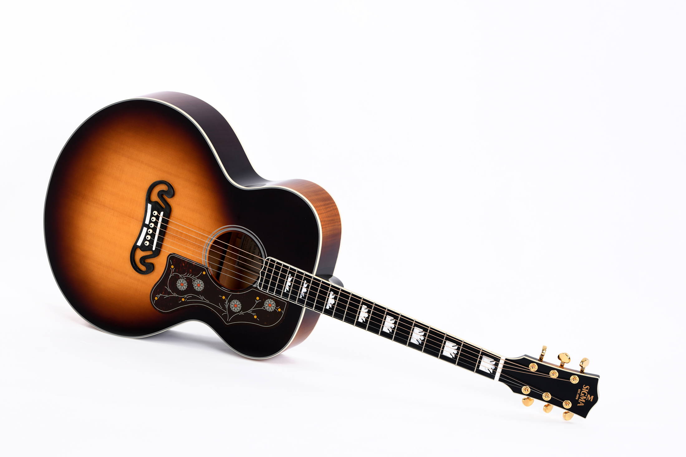 Электроакустическая гитара Sigma GJA-SG200 - это современная и стильная гитара роскошного цвета sunburst с орнаментным рисунком и надежными материалами сборки. Универсальная и максимально удобная для игры, гитара GJA-SG200 обладает верхней декой, выполненной из массива ситхинской ели. Нижняя дека, обечайки и гриф произведены из клена который обеспечивает сбалансированное глубокое звучание. Гитара Сигма оснащена звукоснимателем Fishman Sonitone с переключателями изменения громкости и тона.Электроакустическая гитара Sigma GJA-SG200 невероятно чисто и ярко звучит как при подключении к электронике, так и в акустическом варианте.