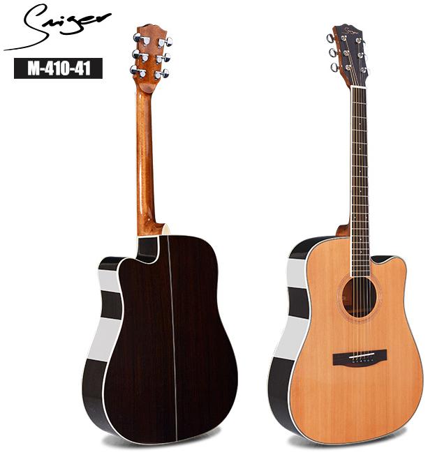 Одна из моделей этой серии, Smiger M-410-41, представляет собой крупный "дредноут", который выполнен из кедра и палисандра. Этот инструмент имеет теплое звучание с более "испанским" оттенком. Глубокий вырез на корпусе значительно облегчает доступ к верхним позициям грифа, что делает эту гитару удобной для игры.