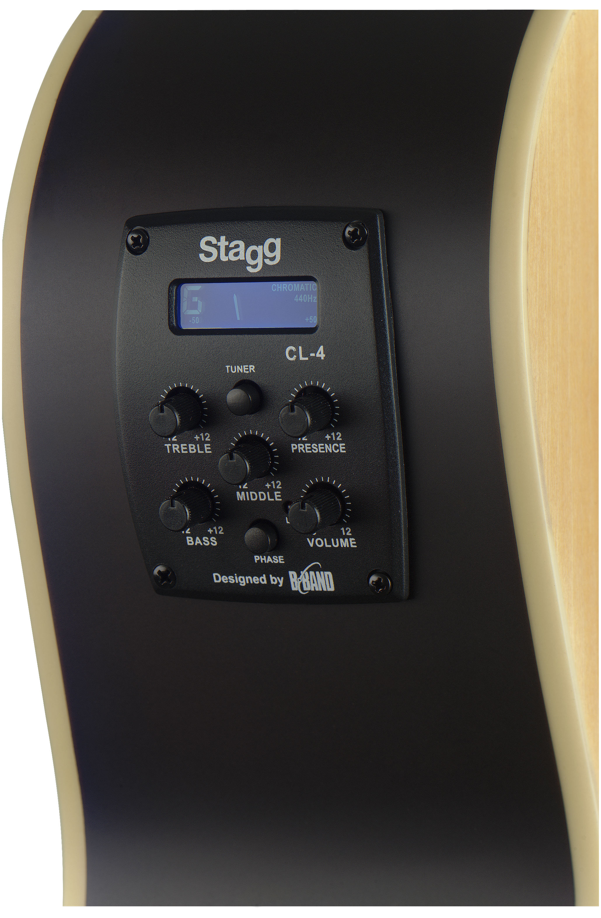 Порожки STAGG SA35 ACE – с обычным углом. Кант верхней и нижней деки, а также грифа – белого цвета, что в сочетании с матовой отделкой выгодно подчеркивает дизайн гитары. Колковый механизм сделан литым никелевым. Наконец, изюминка гитары – её электроника с передатчиком B-Band. Встроены хроматический тюнер, регулятор громкости, регулятор эффекта присутствия, трехполосной эквалайзер и индикатор низкого заряда батареи. Присутствует выходной разъем на классическом 6.35 мм Jack.
