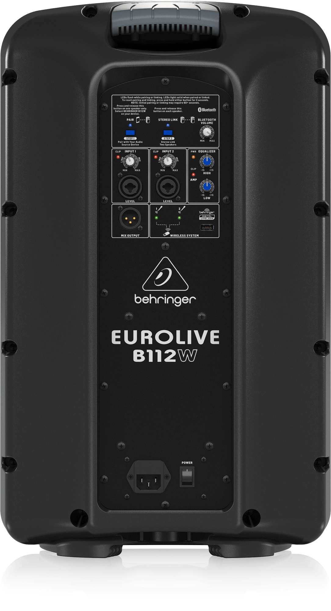 Мощность Behringer EUROLIVE B112W составляет до 1000 Вт. На тыловой панели расположены ручки двухполосного эквалайзера (+/- 15 дБ), а также два основных комбинированных входа на XLR/ TRS, есть и выход XLR-M для посыла копии сигнала источника на другой громкоговоритель с использованием обычного кабеля XLR. Таким образом можно строить многоканальные системы на базе АС серии EUROLIVE.