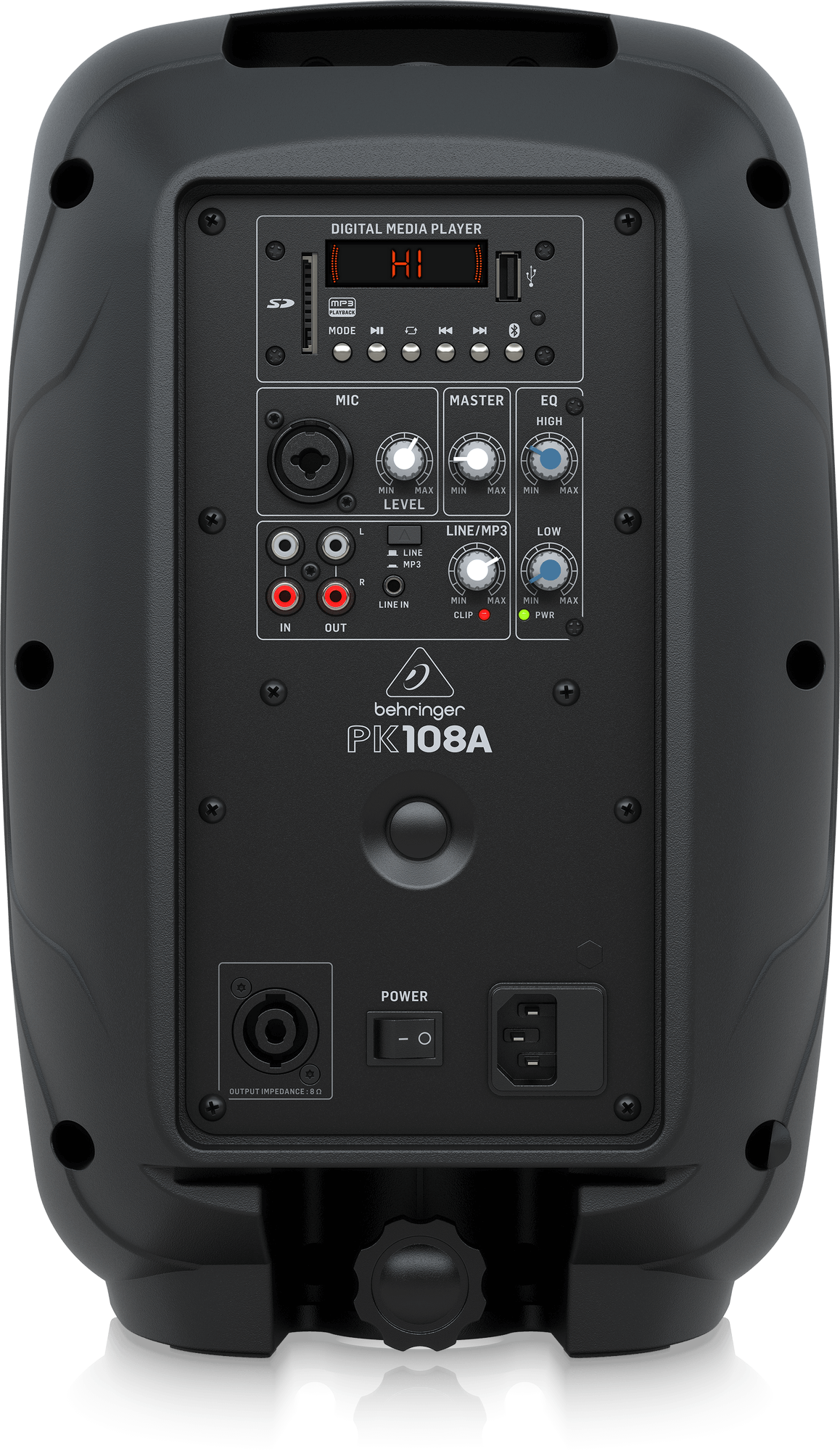 PK108A оснащена встроенным 3-канальным микшером со сверхмалошумными микрофонными предусилителями с большим запасом хэдрума. Также имеются 2-полосный эквалайзер, плюс Bluetooth для потоковой передачи звука напрямую с вашего устройства, 2 автономных микрофонных входа, линейный вход для приема практически любого уровня сигнала, и регуляторы усиления входного сигнала (с Clip светодиодами) для точной настройки. Простой и интуитивно понятный пользовательский интерфейс состоит из отдельного регулятора Level для каждого канала, регулятора общей громкости Master и отдельных регуляторов настройки высоких и низких частот.