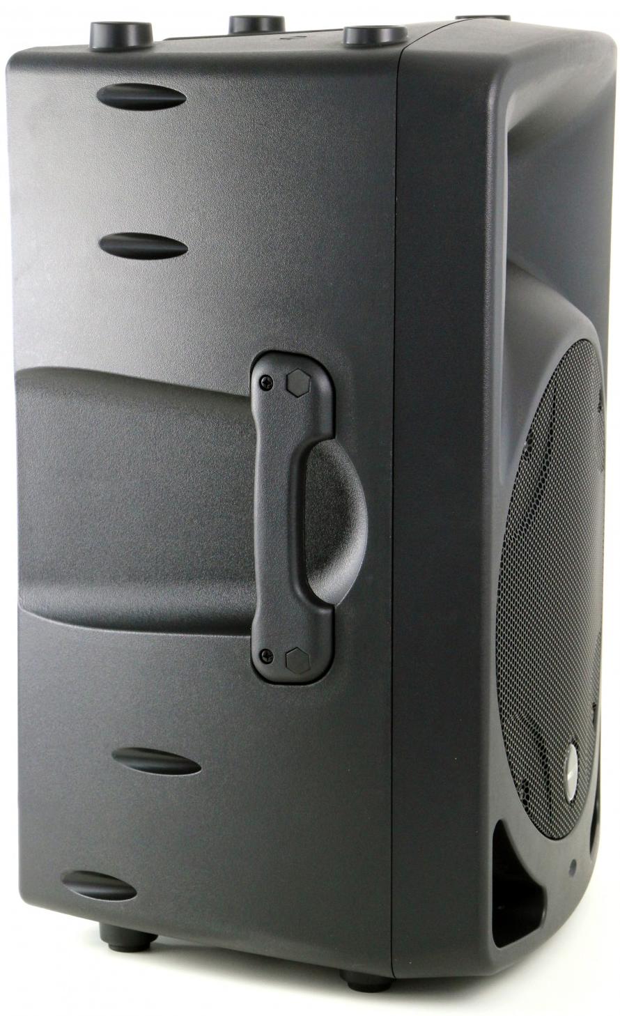 Корпус выполнен из ударопрочного пластика, трапециевидной формы с возможностью использования акустической системы в качестве монитора, две ручки для транспортировки. На нижней части корпуса расположен стандартный 36 мм адаптер для установки акустической системы на стойку. Усилитель класса D, bi-amp, с импульсным блоком питания. Встроенная электронная система защиты усилителя. Встроенный MP3 плеер с возможностью использования носителей USB и microSD, блютуз (Bluetooth) для воспроизведения музыки с мобильных устройств.