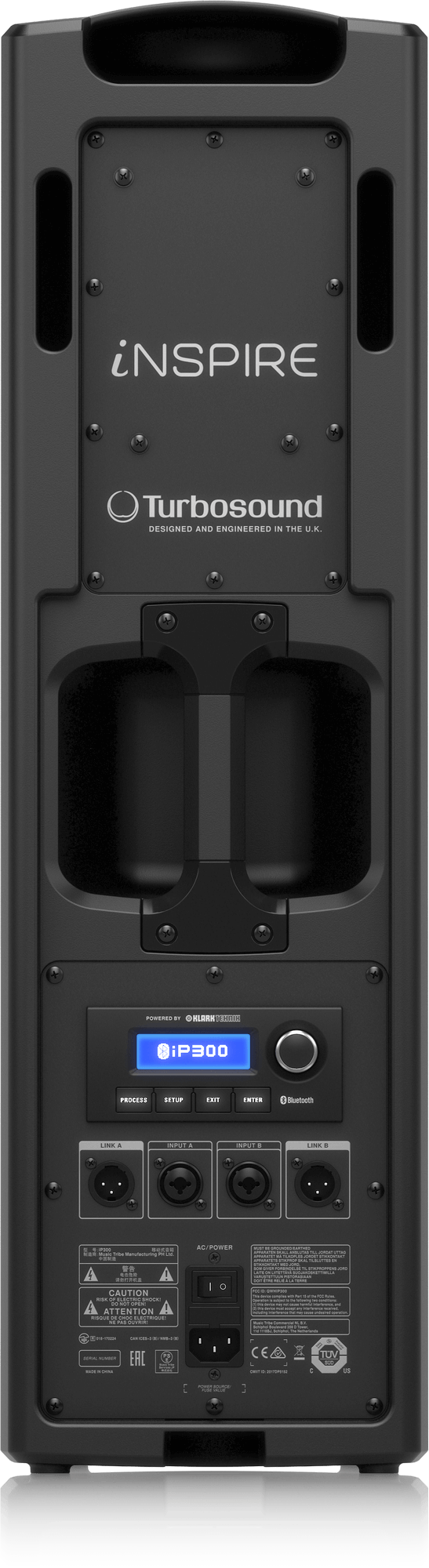 Как и все модели серии iP, данная система оснащена процессором Klark-Teknik со встроенным Bluetooth приёмником. Две системы iP300 могут объединяться для работы по Bluetooth в стерео режиме. Имеются также два стандартных аналоговых входа XLR. Модель Turbosound iP300 может быть установленоа на поверхность стола или на стандартную стойку для АС благодаря стакану диаметром 35 мм. Для переноски предусмотрены две ручки, одна сверху и вторая на задней панели колонки.