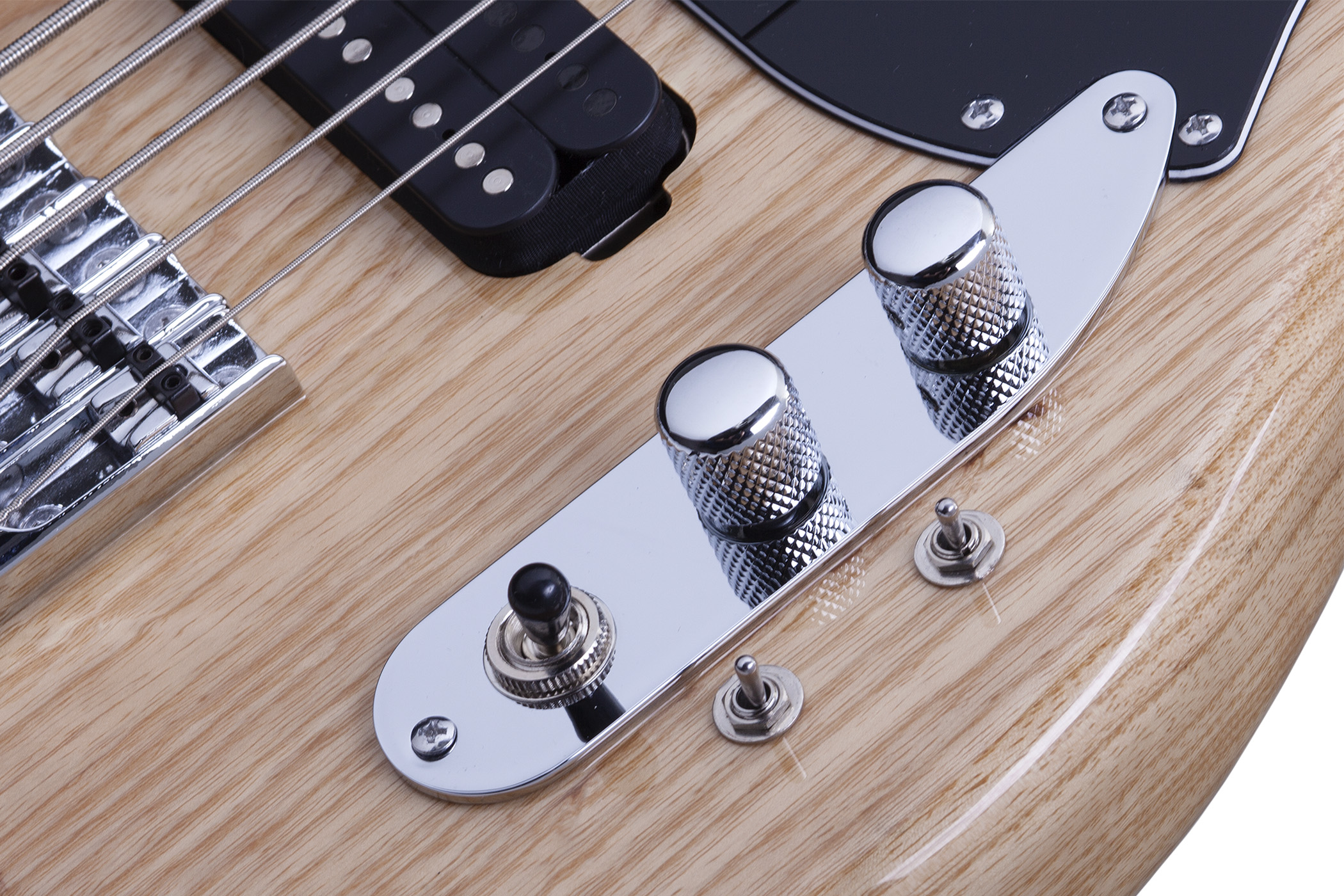 На бас-гитаре установлены два звукоснимателя Schecter Diamond J-Bucker, общая ручка громкости, ручка тона и два переключателя. Один – трёхпозиционный, вы можете выбрать, чтобы звучал нековый, бриджевый или оба звукоснимателя вместе. Второй – трёхполосный, для игры в параллельном, последовательном или сплит режиме. Таким образом, помимо жирно звучащей пятой струны этот бас ещё и очень универсален.