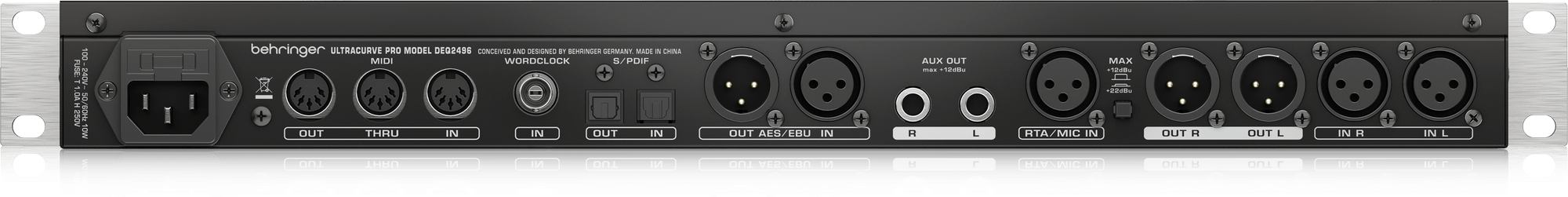 Предусмотрено 64 пользовательских пресета для сохранения всех установок и/или отдельных конфигураций блоков обработки. Управление DEQ2496 осуществляется с помощью многоуровневого меню; графики и числовые значения отображаются на крупном ЖК-дисплее высокого разрешения. Коммутационный интерфейс: аналоговые электронно-балансные основные входы/выходы XLR, стереовыход Aux 1/4" "джек", цифровые входы AES/EBU и S/PDIF (оптика), вход Word Clock, MIDI интерфейс.