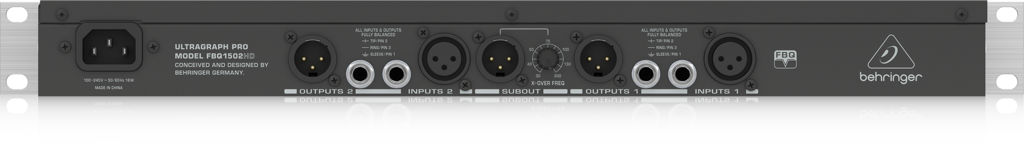 В Behringer ULTRAGRAPH PRO FBQ1502HD интегрированы серво-сбалансированные входы и выходы на 1/4" TRS Jack и XLR. Есть монофонический XLR-выход на сабвуфер с регулируемой частотой кроссовера. Применены сверхмалошумящие двойные операционные усилители 4580, которые гарантируют превосходное звучание. Функции автоматического и принудительного байпаса помогут защитить электронные компоненты. Встроен универсальный источник питания.