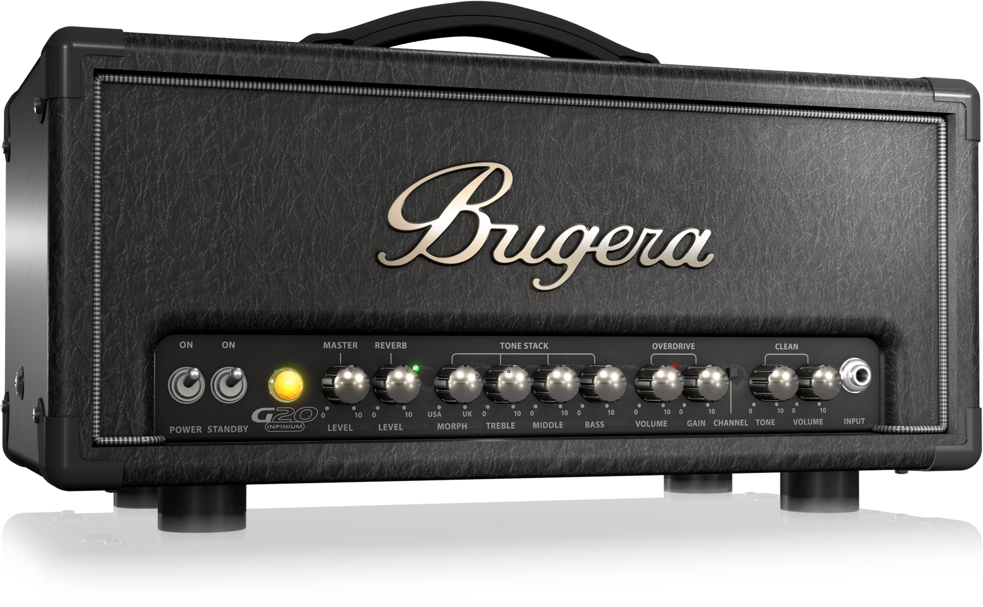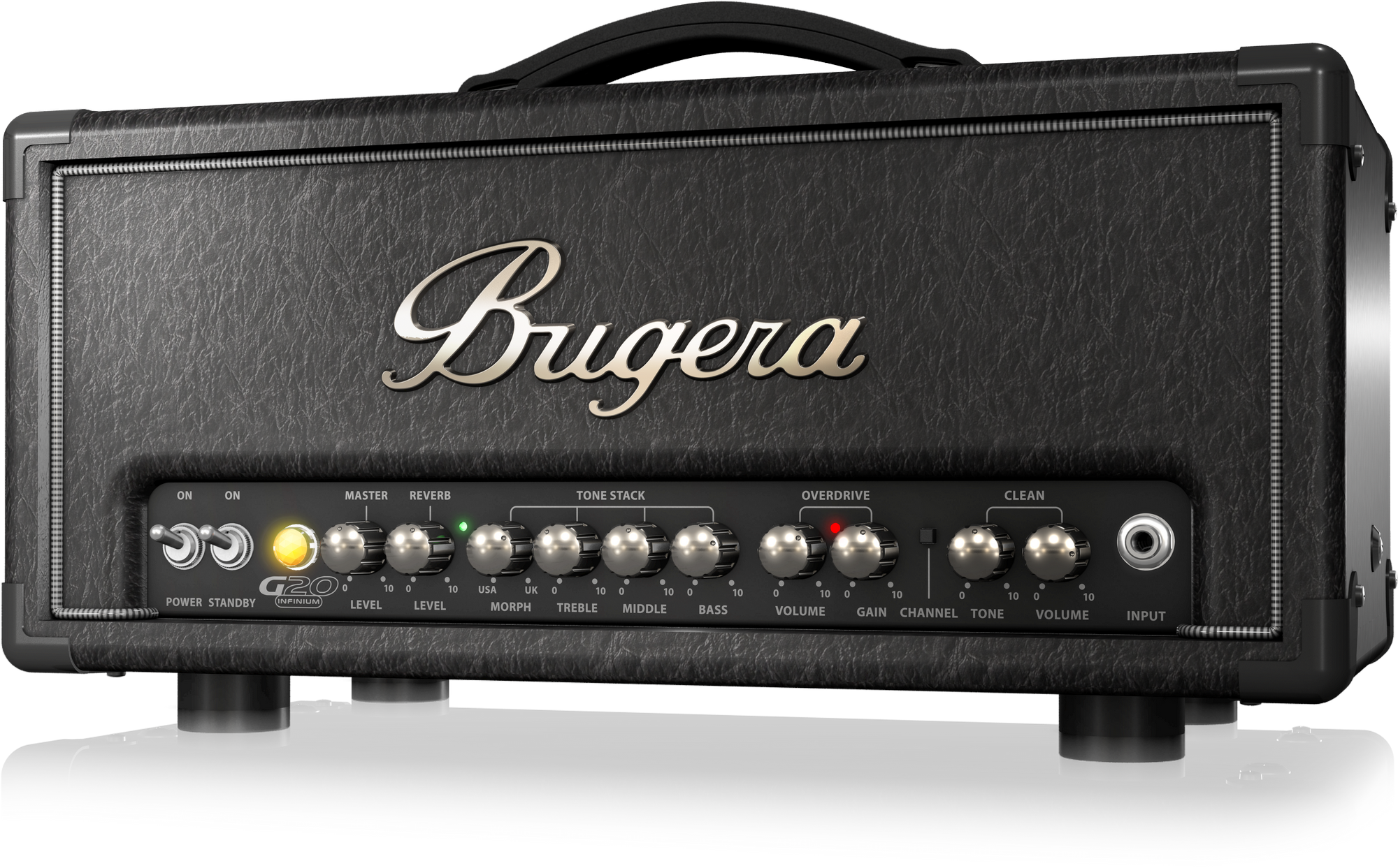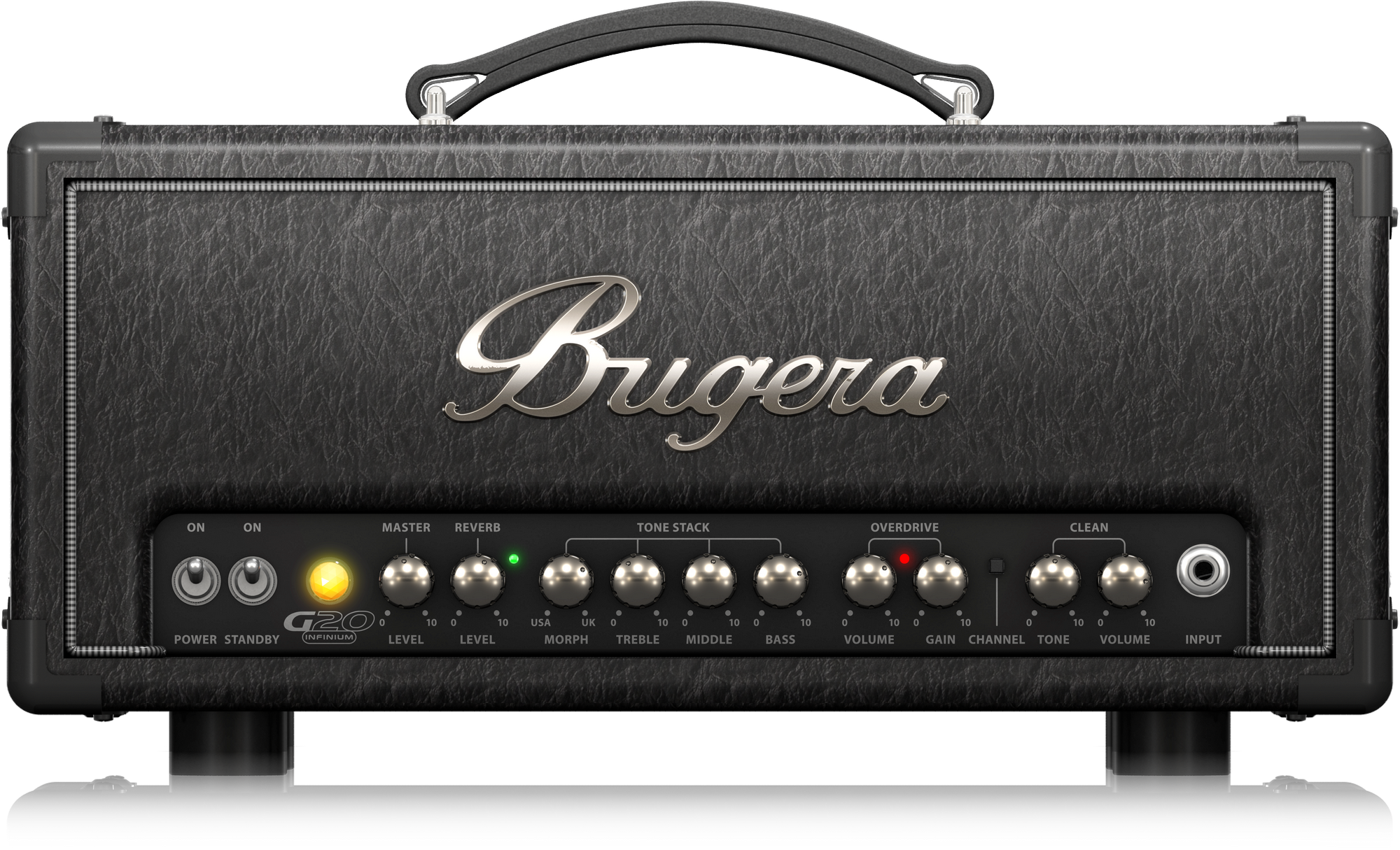 Органы управления Bugera G20-INFINIUM смонтированы в одну линию в нижней части фронтальной панели и имеют четкую маркировку. Усилитель оснащен двумя раздельными каналами Ovedrive и Clean с независимой регулировкой громкости, а также трехполосным регулятором тембра (НЧ, СЧ, ВЧ) с дополнительной настройкой Morf, позволяющий приблизить характер звучания инструмента к «американской» или «английской» школам. Кроме того на передней панели Bugera G20-INFINIUM расположены общий регулятор громкости и регулятора уровня эффекта реверберации.