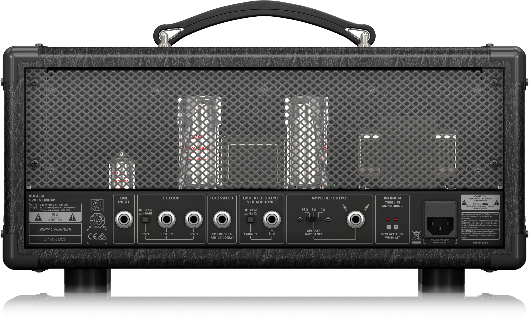 Усилитель для электрогитары Bugera G20-INFINIUM выполнен по классической схеме на лампах и имеет очень надежную конструкцию, в которой используется ряд фирменных технологий. На верхней панели усилителя имеется удобная ручка для его переноски.Аппарат изготовлен в корпусе небольшой высоты на антивибрационных опорах, и поэтому его удобно размещать на верхних панелях акустических систем. Лампы смонтированы внутри корпуса, что обеспечивает безопасное использование усилителя в любых условиях, а эффективный отвод тепла обеспечивается за счет перфорированных передней и задней панелей.