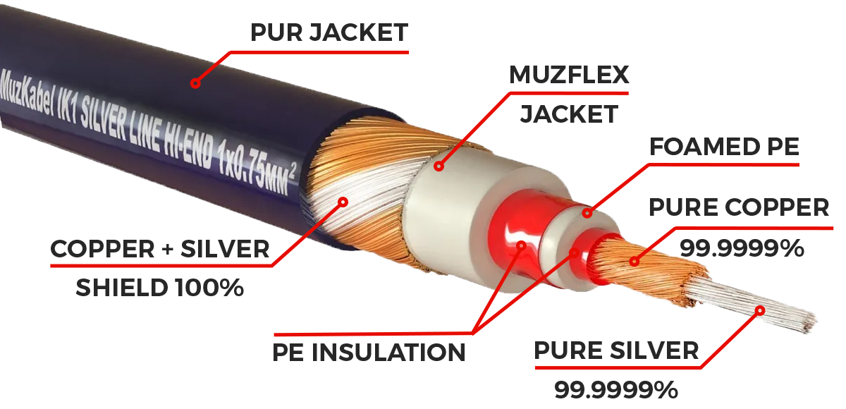 - Проводник: Чистая медь 99,9999% + Серебро 99,9999%