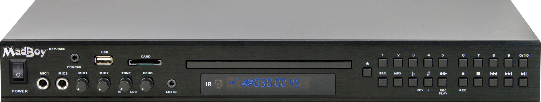 - Вес: 2.4 кг Комплектация:MadBoy MFP-1500-1шт, Пульт дистанционного управления-1шт, Провод RCA-1шт, Шнур питания-1шт, Крепления для установки в стойку-2шт, Батарейки AAА-2шт, DVD-диск 500 песен-1шт, Руководство по эксплуатации-1шт.