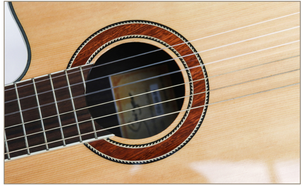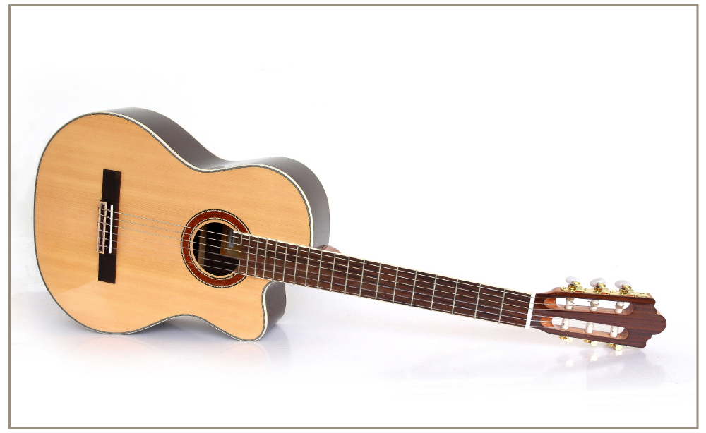 Колки гитары выполнены в золотом цвете с перламутровыми наконечниками, а цвет и покрытие гитары - натуральный и глянцевый соответственно.