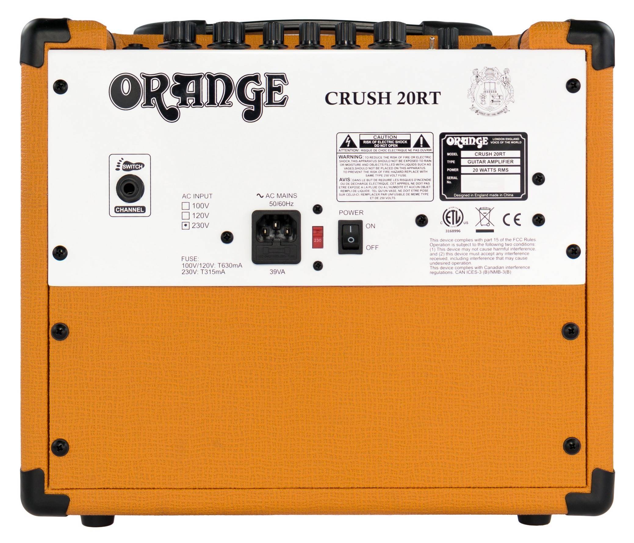 Orange CRUSH 20RT – это двухканальный транзисторный гитарный комбоусилитель, относящийся к известной серии Crush, которая включает в себя множество оборудования для начинающих музыкантов. Данная модель имеет аутентичный звук усилителей Orange и фирменный дизайн, неизменный с 1968 года.Для воспроизведения звука здесь установлен фирменный 8-дюймовый динамик of the World, который превосходно озвучивает как чистый, так и перегруженный тембр, отличаясь узнаваемым «британским» характером с выраженными средними частотами, а также мягкими высокими частотами без «песка». Максимальная выходная мощность усилителя равняется 20 Вт. Для исполнения есть два канала: Clean и Dirty. Последний предлагает достаточно широкий запас искажений, позволяя достичь как плотного и агрессивного хай-гейна, а так блюзового кранча. Для коррекции частотной характеристики имеется гибкий 3-полосный эквалайзер, а для настройки уровня искажений есть регулятор Gain. Придать звучанию объем и пространство можно с помощью встроенного цифрового эквалайзера типа Spring, управляемого лишь одной ручкой. Наконец, удобной работе способствует хроматический тюнер, посредством которого можно легко и точно настроить инструмент.