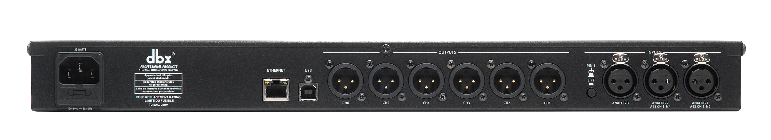 Вход: (3) аналоговые линейные входы / (2) цифровые входы AES (общие разъемы), (1) микрофонный вход RTAВходные разъемы: (3) гнездовых XLR (2 на выбор между аналоговыми / цифровыми аудиоформатами AES), (1) гнездовой XLR RTA микрофонный вход
