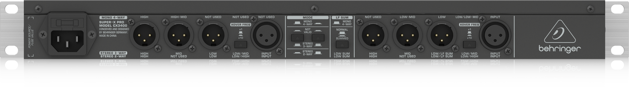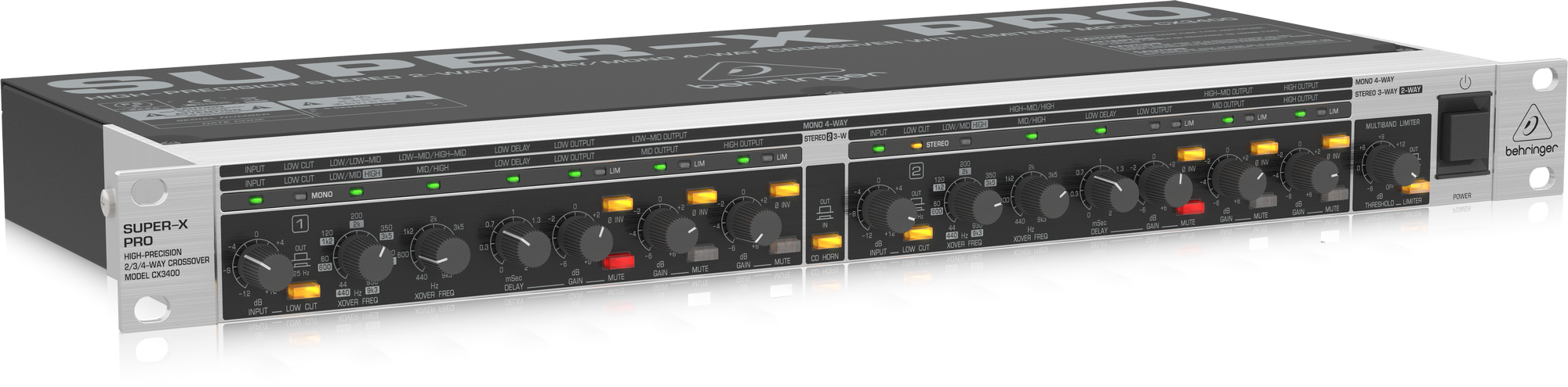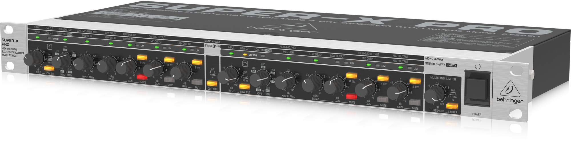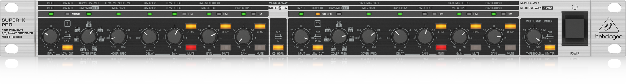 В приборе используются фильтры Линквица-Райли с крутизной среза 24 дБ на октаву. Есть два режима работы, названные здесь как x1 и x10. Переключатель режимов находится на панели коммутации. Для разделения сигнала на низкие, средние и верхние частоты есть следующие варианты частоты кроссовера: 44, 60, 120, 200, 350, 700, 930 Гц (x1) и 440, 600, 1200, 2000, 3500, 7000 и 9300 Гц (x10). Каждый из каналов оборудован НЧ-фильтром на 25 Гц (12 дБ на октаву) для подавления инфраниза, регуляторами усиления для каждого из трех частотных диапазонов, функцией инверсии фазы, кнопками Mute, а также задержкой до двух мс, что позволяет выровнять фазу сигнала при далеком расположении колонок друг от друга. В наличии имеются лимитеры для каждого из каналов, способные ограничить пики громкости, и защитить динамики от поломки. Все кнопки имеют светодиодную подсветку, также присутствуют индикаторы, сигнализирующие о наличии искажений, активации лимитера и фильтра, а также отображающие наименования полос. Наконец, есть клавиша CD Horn, корректирующая звучание при использовании рупоров постоянной направленности, а также функция Low Sum, суммирующая низкие частоты для отправки моно-сигнала в сабвуфер.
