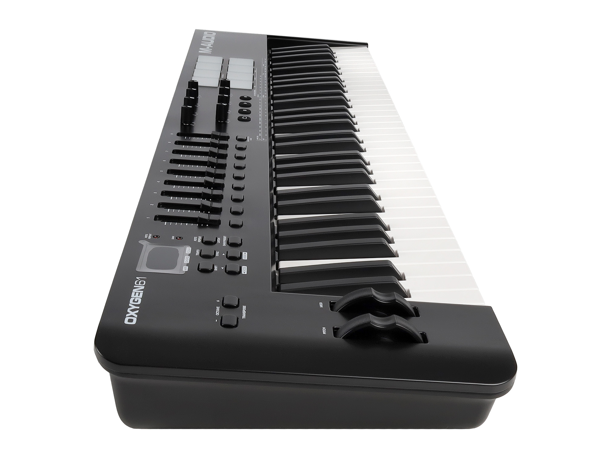 Контроллер Oxygen 61 (MKV) включает 8 чувствительных к скорости пэдов, 8 назначаемых регуляторов и 9 фейдеров, что позволяет детально управлять плагинами, виртуальными инструментами и миксом. Функция Note Repeat значительно облегчает бит-продакшн, предоставляя возможность воспроизводить ритмичные паттерны в реальном времени. Режимы Momentary и Latch дают гибкость в управлении повторяющимися нотами и делают работу с пэдами более интуитивной.
