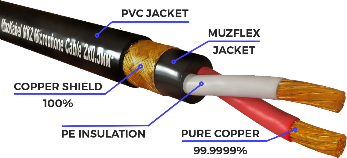 Модель: MBXMK2 - это профессиональный микрофонный шнур, который был создан с использованием новейших технологий. Сочетание двух жил по 0.5 мм² делает звук насыщенным и ярким. Кабель имеет плотный плетёный экран, изготовленный из чистой меди и покрывающий 100%, что помогает уменьшить внешние помехи и гарантирует отсутствие искажений.Другой особенностью MBXMK2 являются фирменные позолоченные разъемы MuzKabel, которые имеют повышенную износостойкость и обеспечивают стабильное подключение без потери качества. Кабель производится в России, а все компоненты разъемов изготовлены фирмой MuzKabel.