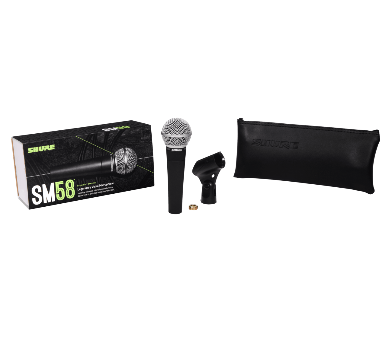 Shure SM58 – ручной микрофон с динамическим кардиоидным капсюлем. Кардиоидная диаграмма направленности даёт хорошее усиление перед возникновением обратной связи, а её равномерный шаблон – превосходный захват звука в узкой области. Плюс к этому у микрофона – расширенный диапазон средних частот и НЧ-фильтр для элиминации низкочастотного гула. Данный микрофон идеален для живого использования, так и для записи в студии: частотная характеристика идеально подходит для лид- бэк-вокала, а также караоке. Неодимовый магнит улучшает показатели «сигнал/шум», а прочная конструкция передатчика с проверенной антишоковой системой и решеткой из закалённой стали выдержит тяготы туровой жизни и использования на концертах.Кроме того, в Shure SM58 интегрирован поп-фильтр для снижения шума ветра и дыхания, а также ветрозащита. Сам картридж тоже усилен противоударной металлической сеткой, а микрофон – прочным корпусом. В комплекте поставляется адаптер для микрофонной стойки и сумка на молнии для хранения и переноски.
