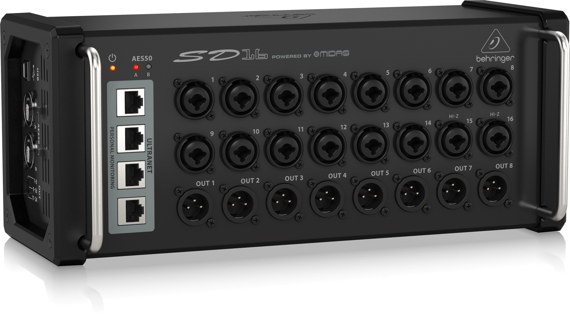 Встроенный распределительный порт ULTRANET обеспечивает питание и 16 аудио каналов к четырем BEHRINGER POWERPLAY P16-M через экранированный кабель CAT5e. Два программируемых входа совместимы с источниками Hi-Z, для подключения клавишных, акустических, бас-гитар, и т.д., без необходимости использования DI бокса. SD16 также оснащен портом USB для быстрого и легкого обновления системы через ПК.