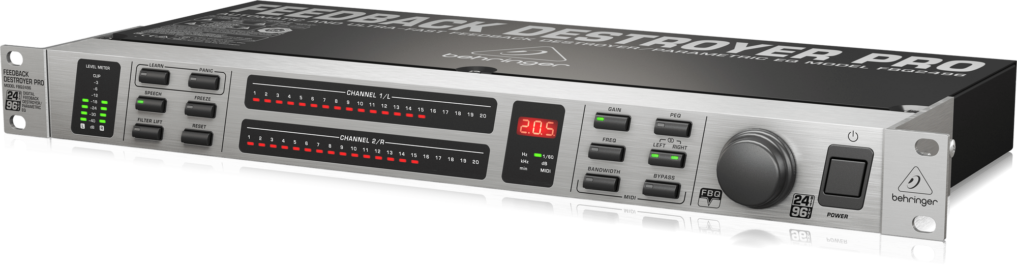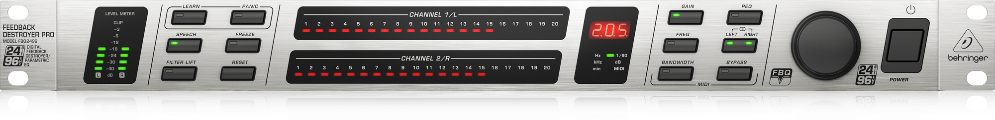 Эквализация в Behringer FBQ 2496 Feedback Destroyer Pro осуществляется с внутренним разрешением 32 бит. Устройство позволяет автоматически определять и устранять до 40 частот, чего обычно бывает достаточно для устранения многих артефактов звука, вызванных обратной связью.