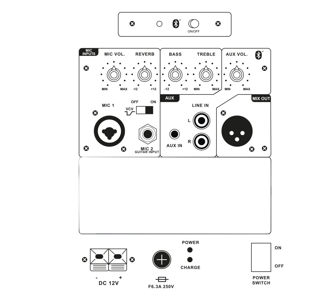 Управление: громкость микрофона, громкость реверберации, линейная громкость, переключатель VCV вкл. / выкл., мастер громкость, высокие частоты, бас, беспроводная технология Bluetooth вкл. / выкл.