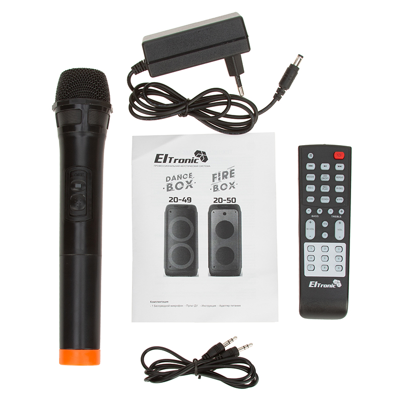 Микрофон беспроводной -1 шт, Пульт Д/У, Кабель питания, Кабель AUX |