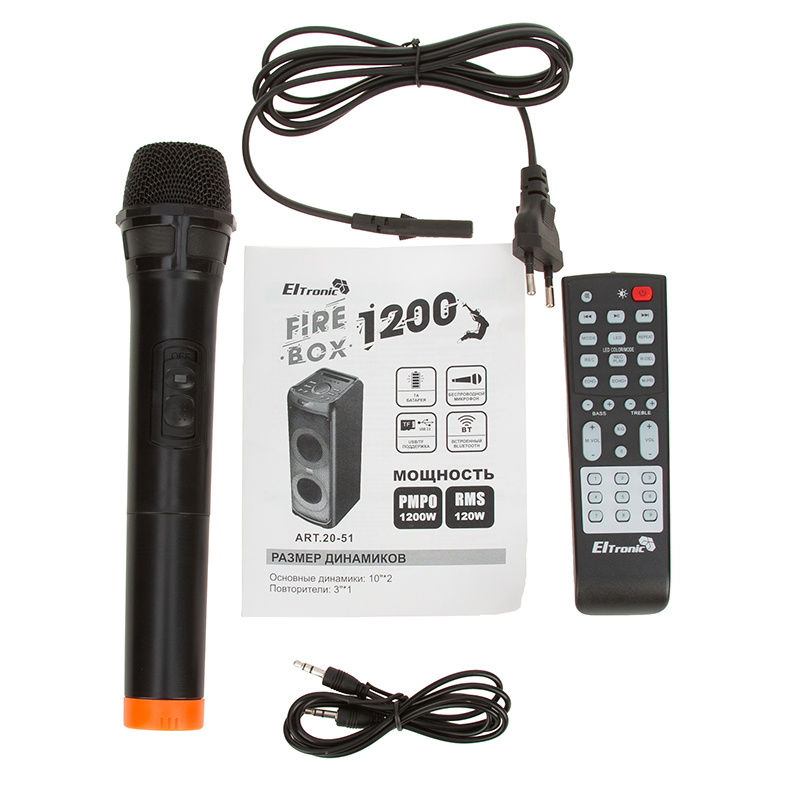 Микрофон беспроводной -1 шт, Пульт Д/У, Кабель питания, Кабель AUX |