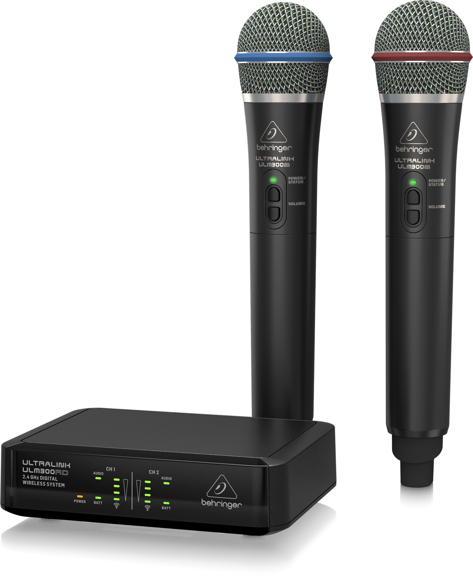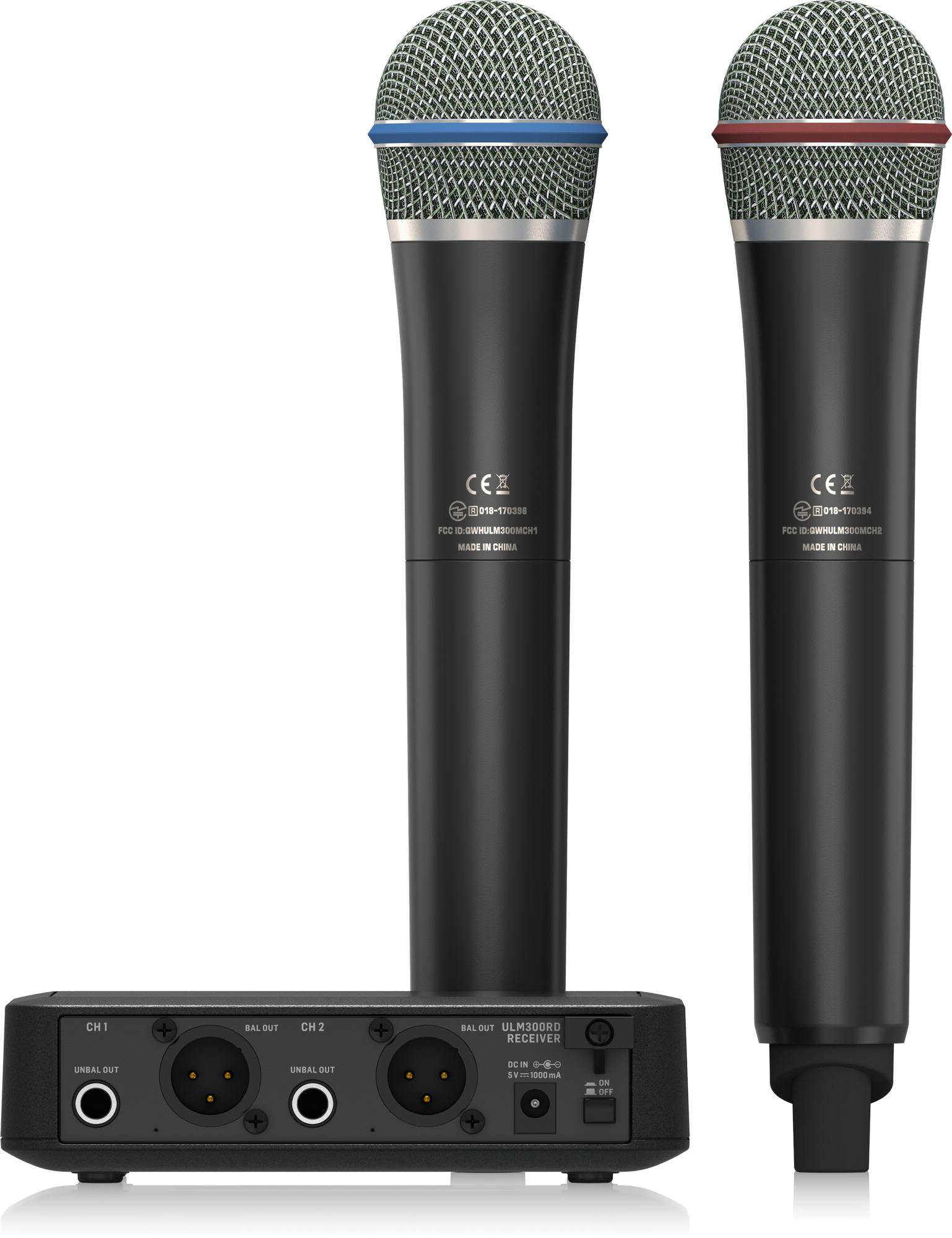 - Комплект, состоящий из двух беспроводных ручных микрофонов ULM300M и двухканального приемника ULM300RD