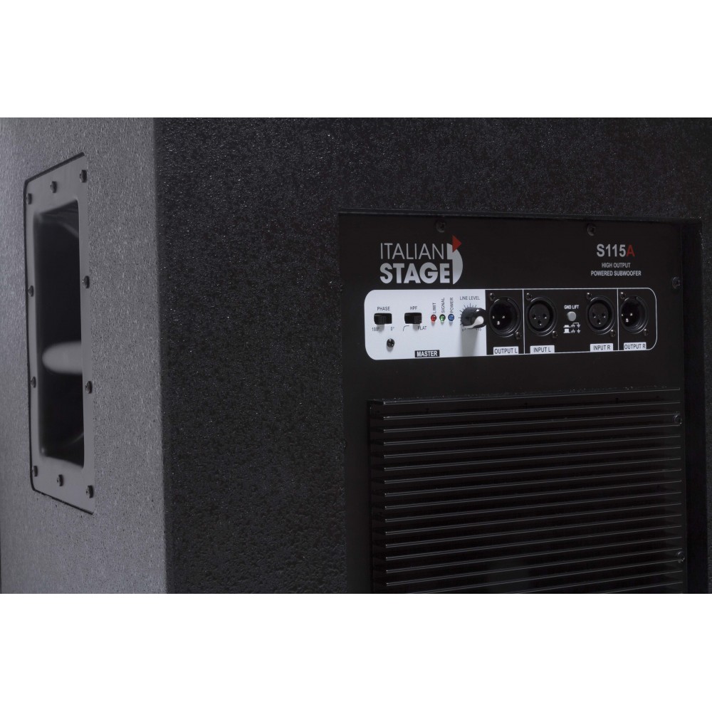 Работа S115A осуществляется усилителем класса АВ, подающим 350 Вт на вуфер, воспроизводящий сверхнизкие частоты: 20 - 120 Гц . Также на задней панели S115A расположены переключатель фазы, позволяющий изменить полярность сабвуфера, переключатель GND Lift, этот переключатель отрывает контакт земли в симметричных аудиовходах от земли усилителя. Линейные входы позволяют осуществлять подключение посредством разъемов XLR, а наличие линейного выхода позволит осуществить подключение дополнительной активной акустической системы.