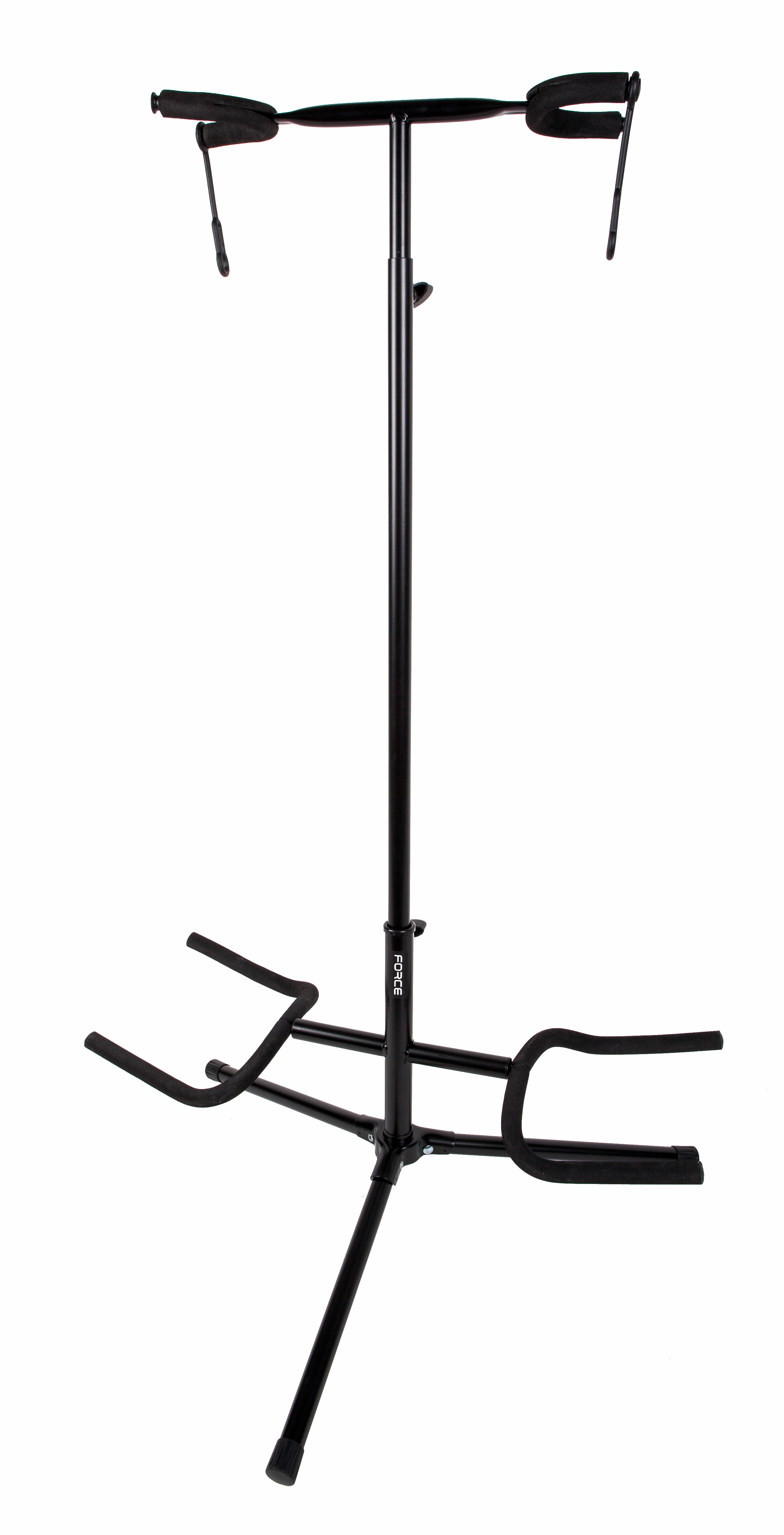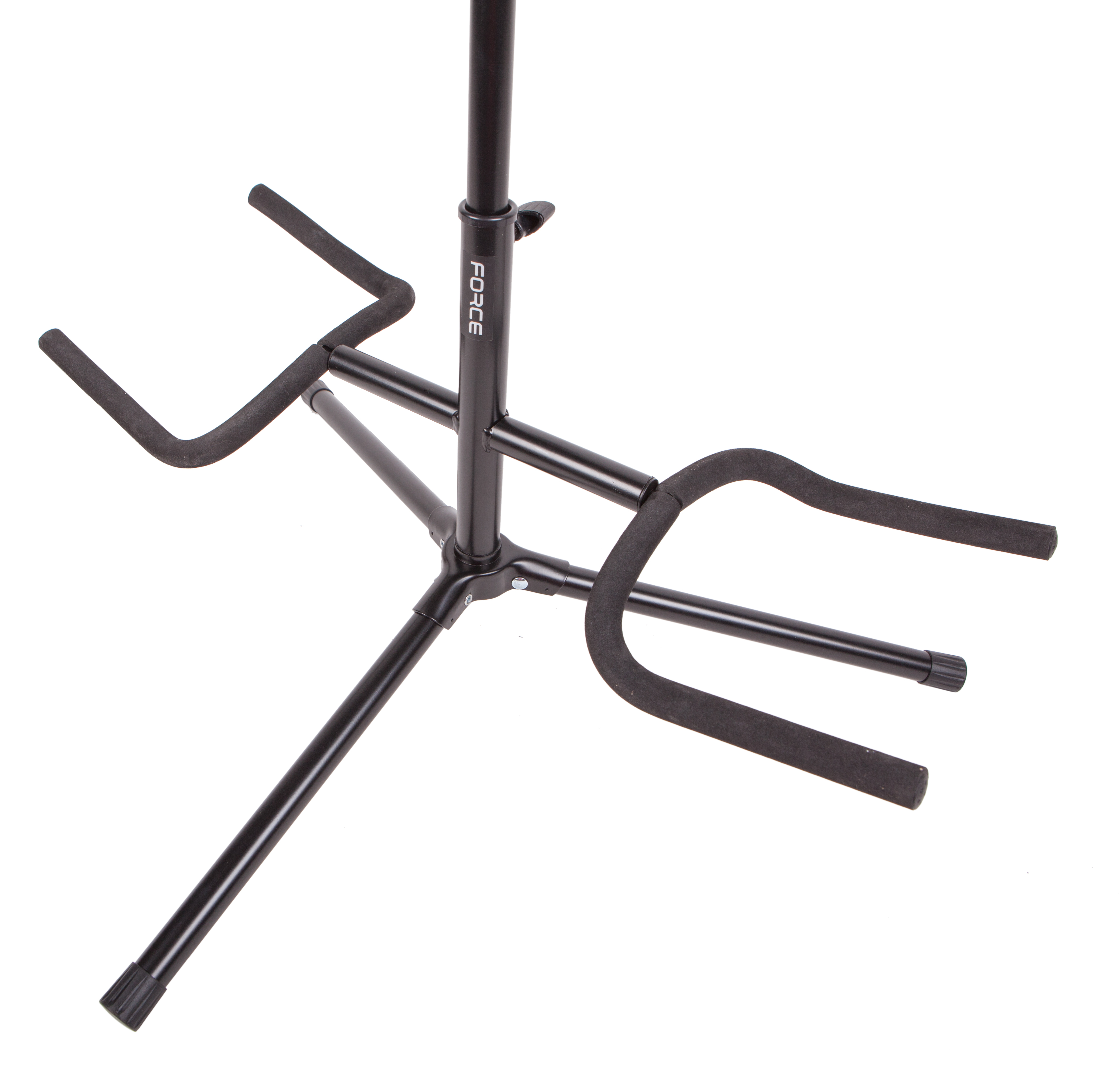 Двойная стойка с универсальным держателем и защитным держателем грифа для акустических, классических, электро и бас гитар. Вертикальная стойка с регулируемым защитным хомутом для грифа. Антискользящий натуральный каучук. Универсальные держатели адаптируются к любому инструменту.