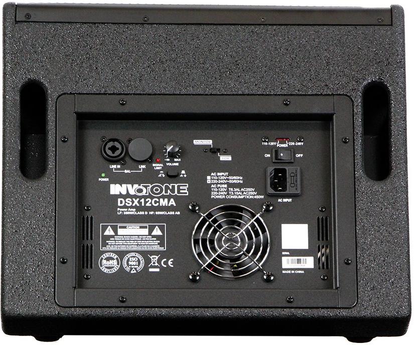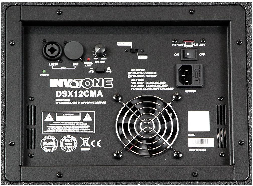 Угол раскрытия 70°, осесимметричный. На панели управления расположены: ручка регулятора уровня сигнала, переключатель режима работы монитора FOH/MON, балансный XLR/Jack вход, выходной разъем XLR-link для подключения дополнительной активной акустики, светодиодные индикаторы наличия питания и лимитера, кнопка включения/выключения и разъем для подключения питания. Система защиты от тепловой перегрузки и перепадов напряжения обеспечивает стабильную работу Invotone DSX12CMA в самых сложных условиях. Корпус из березовой фанеры имеет стакан для установки на стойку и две эргономичные ручки. Стальная перфорированная решетка защищает динамики от механических повреждений.