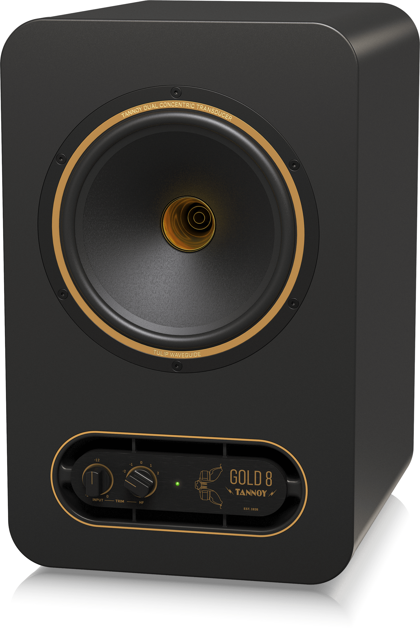 Главная отличительная черта данного устройства представляет собой использование легендарной технологии Dual Concentric, которая была впервые применена компанией Tannoy в 1947 году. Такая уникальная конструкция динамиков обеспечивает наиболее точную фазовую согласованность и прекрасную визуализацию элементов микса в точке прослушивания. Звучание этой мониторной системы можно смело сравнить с широкополосными колонками с одним динамиком, которые отличаются наиболее информативным и натуральным тембром, однако имеют проблемы с нелинейностью и узким частотным диапазоном, чего лишен монитор линейки GOLD. Озвучивают аудиосигнал здесь 8-дюймовый коаксиальный вуфер и 1-дюймовый титановый твитер, использующий волновод Tulip. Частотный диапазон простирается от 54 Гц до 20 кГц по уровню +/-3 дБ. Встроенный усилитель работает в классе A/B и обеспечивает 300 Вт общей максимальной выходной мощности. Активный кроссовер располагается на частоте 1.5 кГц, а уровень максимального звукового давления способен достигать 110 дБ.
