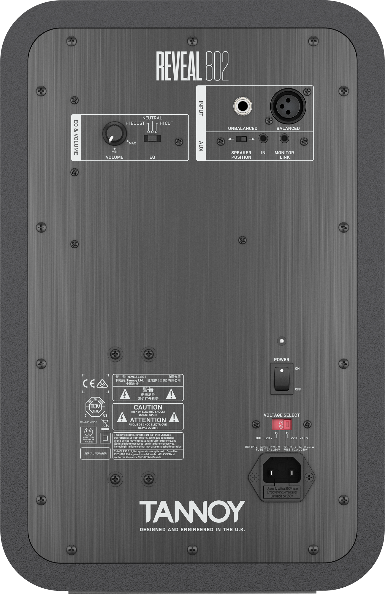 Кабинет Tannoy Reveal 802 состоит из изготовленного вручную НЧ-динамика диаметром 8” и ВЧ-динамика диаметром 1” с мягким куполом, которые обеспечивают ровную АЧХ и широкий угол распространения звука. Сам кабинет выполнен из МДФ. Снизу АС располагается щелевой фазоинвертор, благодаря которому вы получите более насыщенный нижний диапазон частот. К числу основных особенностей монитора относится схема двойного усиления (bi-amp): это значит, что отдельно усиливается сигнал на низкие и средние, и отдельно на высокие частоты.