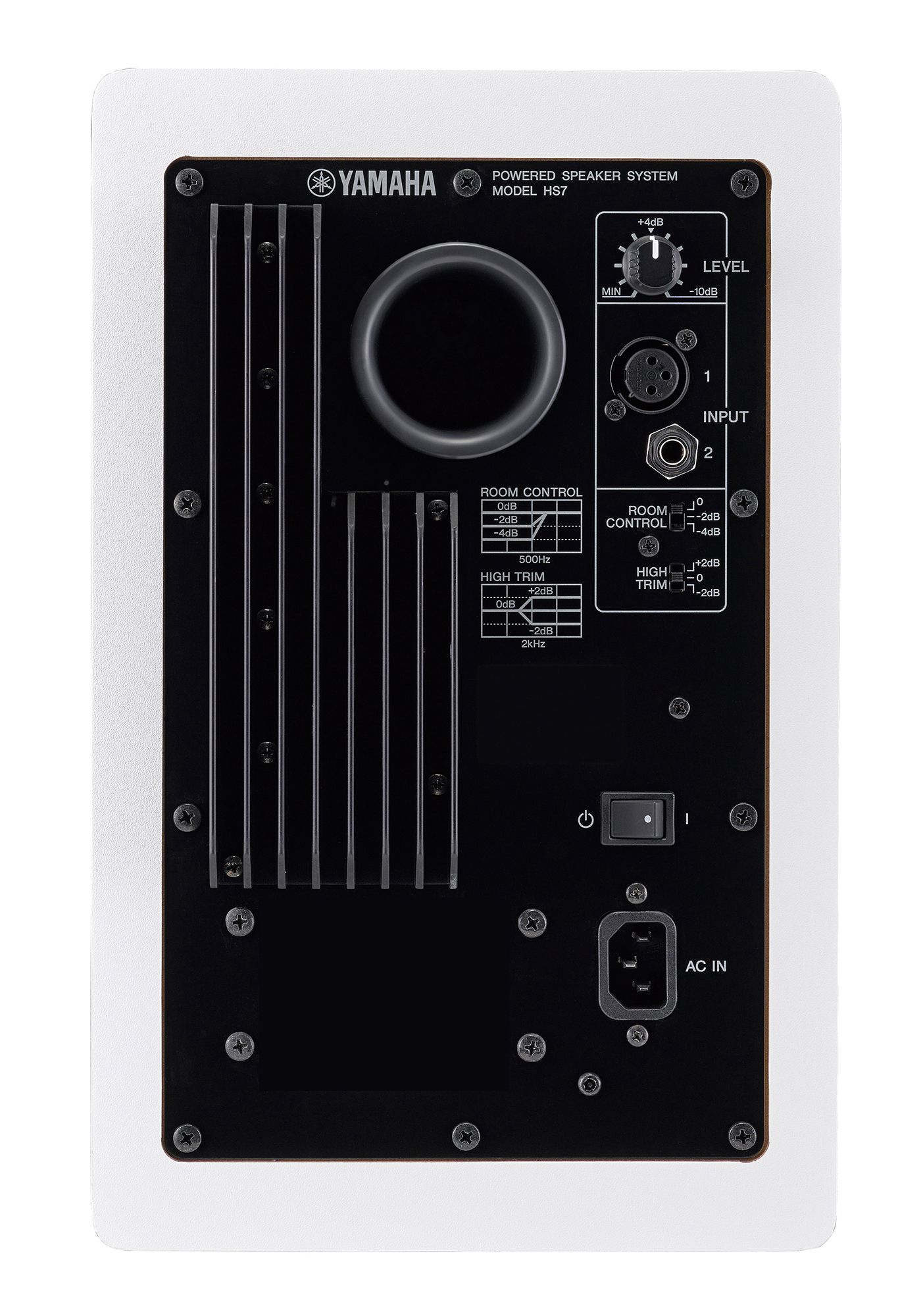 В корпусе Yamaha HS7 находятся два усилителя мощностью 60 и 35 Вт. На тыльной поверхности кабинета можно найти два балансных входа: один XLR-F и один 1/4" TRS Jack. Там же есть регулятор громкости и два переключателя HIGH TRIM и ROOM CONTROL: первый управляет работой ВЧ-усилителей, уменьшая или увеличивая уровень сигнала на +/- 2 дБ, а второй переключатель подстраивает нижнечастотный диапазон (0/-2/-4 дБ), помогая избежать ненужных отражений. Переключатели рекомендуется использовать для подстройки в соответствии с конфигурацией помещения, а также рекомендуется использовать данные мониторы в связке с сабвуфером Yamaha HS8S.