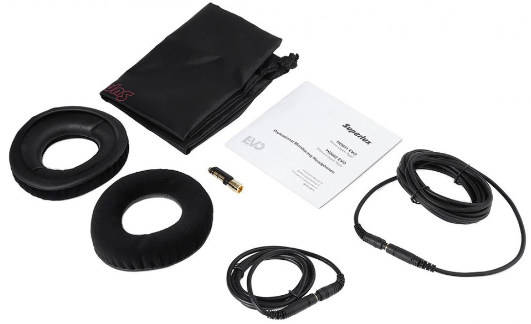 В комплекте: 1 пара велюровых сменных амбушюр, переходник с 3,5 на 6,3 джек, 2 х съемных кабеля (3 и 1 м), кабельный зажим, чехол