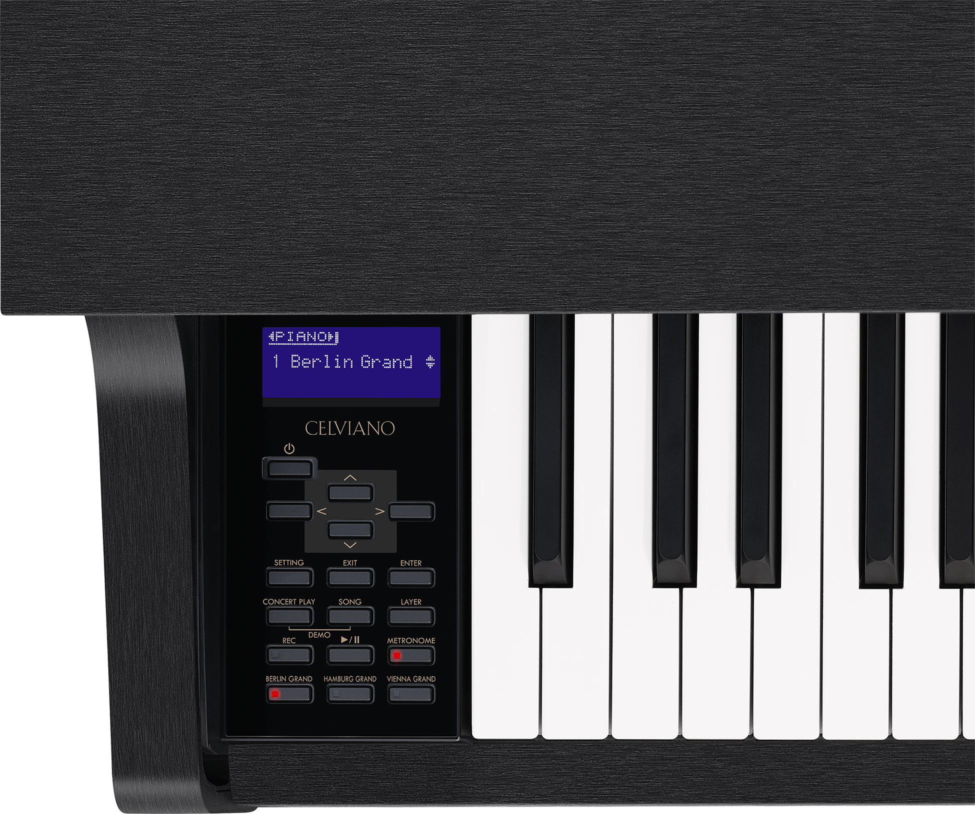 В серии CELVIANO Grand Hybrid представлено целых 26 тембров, включая тембры трех знаменитых роялей, в числе которых Berlin Grand, Hamburg Grand и Vienna Grand. Эти инструменты позволяют вам создавать звучание, близкое к исключительным концертным роялям с богатыми акустическими резонансами и выразительностью.