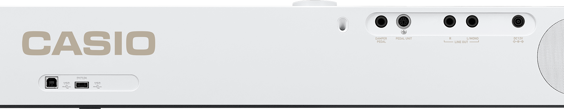 Разъёмы: PHONES / OUTPUT: PHONES: 2 (стерео мини джек), разъем для педали, разъем для 3-педального блока, LINE OUT: 2 L / MONO, R (стандартный разъем), USB типа A (беспроводной MIDI и аудио адаптер), USB типа B