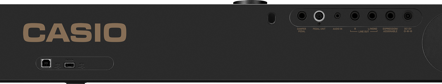 Разъёмы: PHONES / OUTPUT: PHONES: 2 (стерео мини джек), разъем для педали, разъем для 3-педального блока, разъем EXPRESSION / ASSIGNABLE, LINE OUT: 2 L / MONO, R (стандартный разъем), разъем AUDIO IN, USB типа A (беспроводной MIDI и аудио адаптер), USB типа B